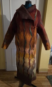 2020De jas omhult en verhult. De schapenvacht voelt als een warme deken. De gekleurde organische vorm brengt je terug naar onze bron, de natuur evenals de wol zelf.